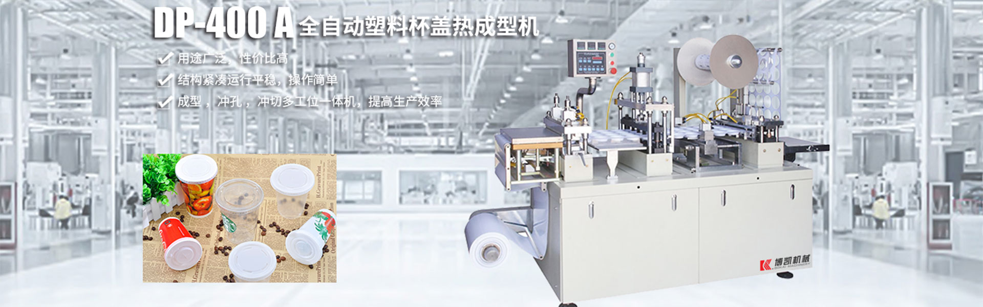 瑞安市博凱機(jī)械有限公司位于祖國的東海之濱,享有中國包裝機(jī)械城之譽(yù)的美麗海濱城市------瑞安。瑞安是中國著名的包裝機(jī)械、制藥機(jī)械生產(chǎn)基地。瑞安市博凱機(jī)械有限公司主營:一次性杯蓋機(jī),杯蓋成型機(jī),塑料杯蓋成型機(jī),全自動(dòng)塑料成型機(jī);借助于其得天獨(dú)厚的資源優(yōu)勢(shì),結(jié)合市場(chǎng)需求以及多年生產(chǎn)鋁塑包裝機(jī)技術(shù),吸取吸塑機(jī)的優(yōu)點(diǎn)創(chuàng)新研發(fā)的新型產(chǎn)品Dpp400F吹塑成型機(jī)!該機(jī)實(shí)現(xiàn)了放卷,成型,沖孔,沖裁,出料,收卷···